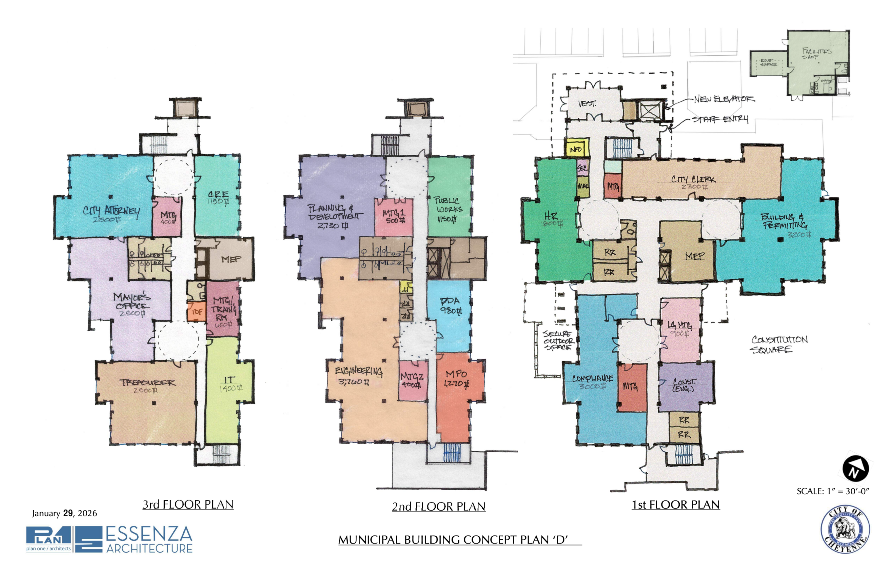 Under the current concept, the first floor of the Municipal Building would house public-facing services such as the city clerk, Building and Permitting, Human Resources and Compliance. The second floor would include Engineering, Planning and Development, Public Works, the Downtown Development Authority and the Metropolitan Planning Organization. The third floor would be reserved for the mayor’s office, city attorney, treasurer, IT department and Community Recreation and Events, along with a mechanical room. Each level would feature shared meeting spaces.