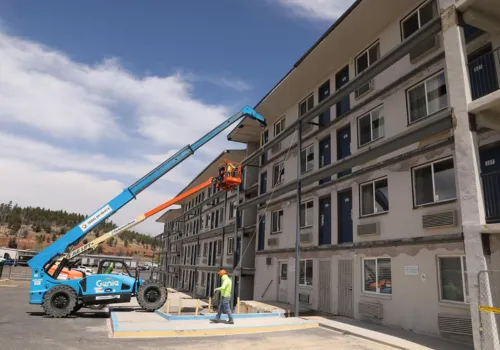 When finished, The Lantern will offer 103 furnished units, including ADA-accessible spaces, each with its own kitchenette. New walkways, stairwells, and railings are already under construction while crews tackle the interior upgrades.