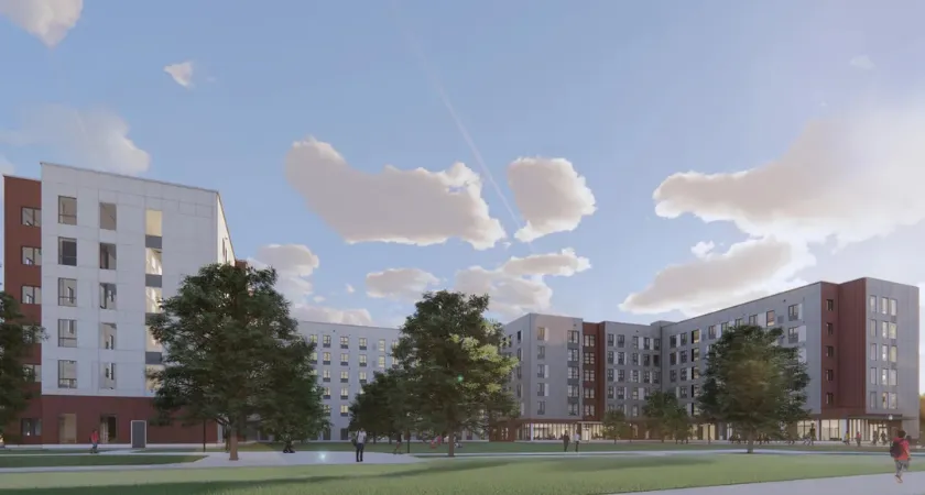 The north residence hall will span 173,739 square feet with 134 units, while the residence hall south will measure 135,177 square feet and contain 105 units. Amenities include expanded study spaces and common areas, community wellness rooms, a grab-and-go cafe and an outdoor courtyard space with walking and bike paths, per Gilbane.