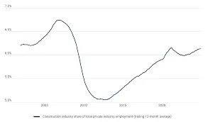The post-pandemic years saw a temporary surge, with construction classified as an essential service in most states, allowing it to avoid the widespread job losses that hit other industries. Employment share briefly exceeded 6.4% before settling into its current range of 6.0–6.3%.