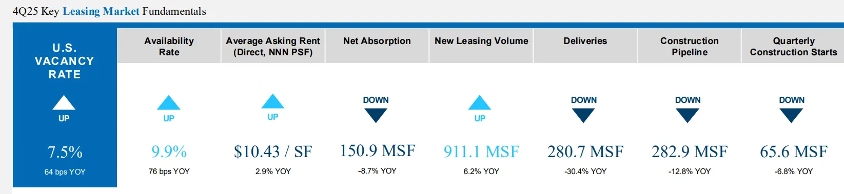 Quarterly construction starts totaled 65.6 million square feet in Q4 2025, while the total construction pipeline stood at 282.9 million square feet—down 12.8% year-over-year but showing signs of stabilization after consecutive quarters of sharp contractions.