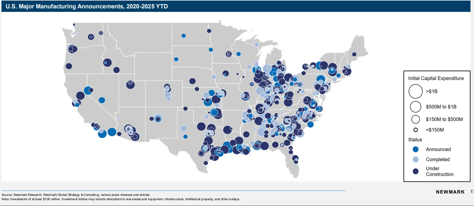 A major bright spot for industrial construction comes from domestic manufacturing expansion. Since 2020, approximately $772 billion in manufacturing investments have been pledged across the U.S., supporting over 400,000 new jobs and a minimum of 350 million square feet of new industrial projects. Much of this development has already been delivered.