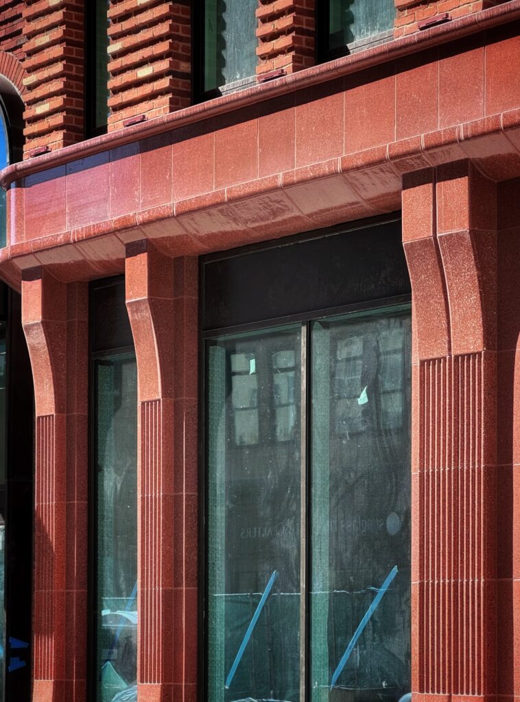 Detailed craftsmanship is evident throughout the façade, including intricate brick bond patterns and sculptural stone elements. Select sections of glazed green brick further enhance the building’s visual character, contributing to a modern yet contextually sensitive aesthetic.